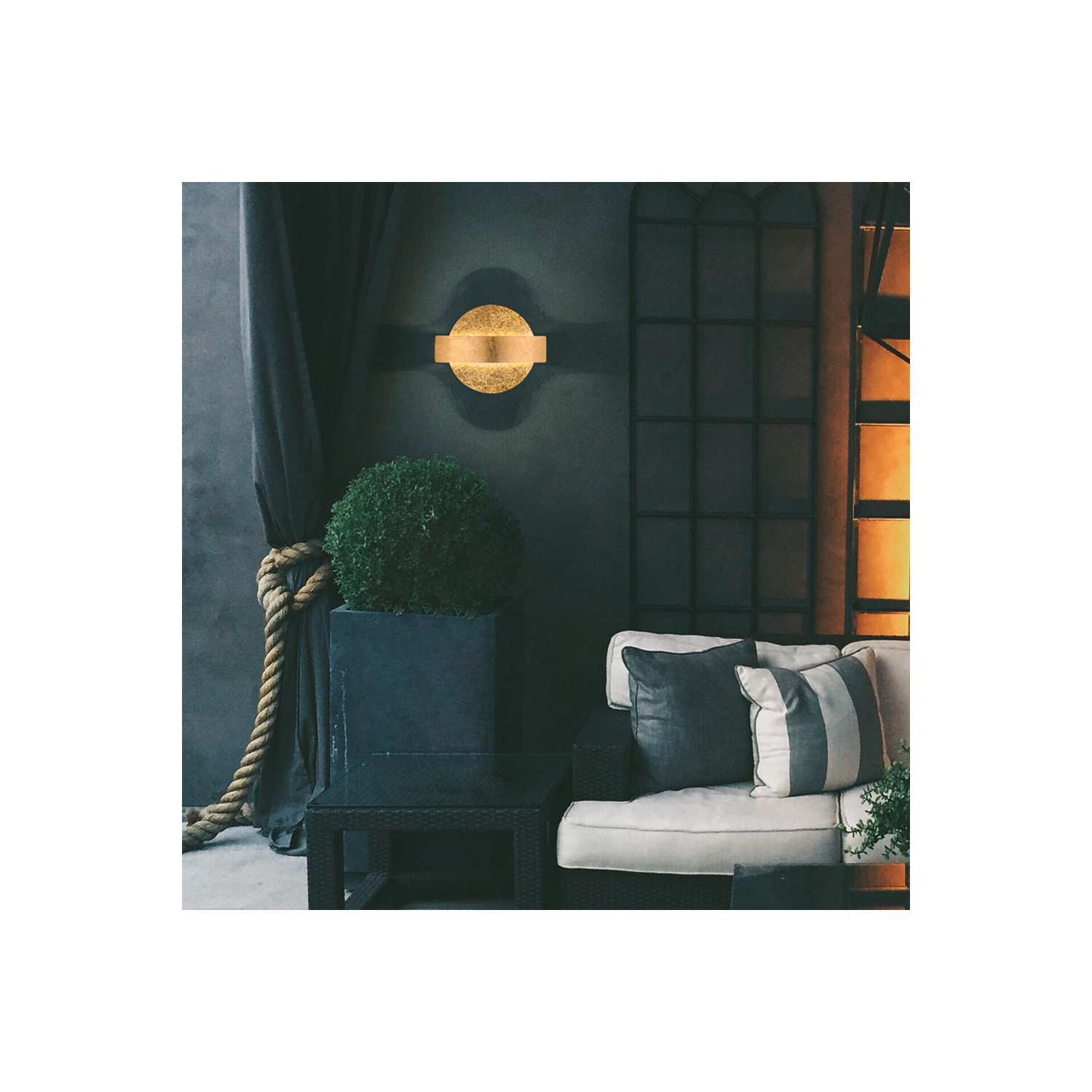 El singular aplique Koben, decorado con pan de oro, de diseño moderno y con iluminación indirecta, promete no pasar desapercibido, en ningún espacio.