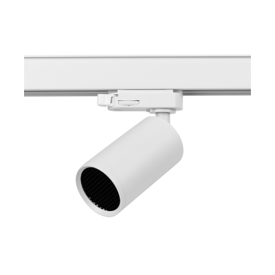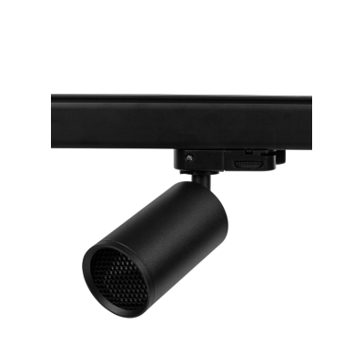 Mini proyector decorativo de superficie y carril para lámparas GU10 de 50 mm de diámetro, con sistema de fijación de la lámpara mediante rosca y rejilla antideslumbrante incluida.