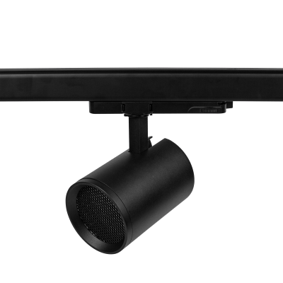 Proyector de carril de 20W con adaptador trifásico y ópticas disponibles en varios grados de apertura que permiten mayor control de la luz.