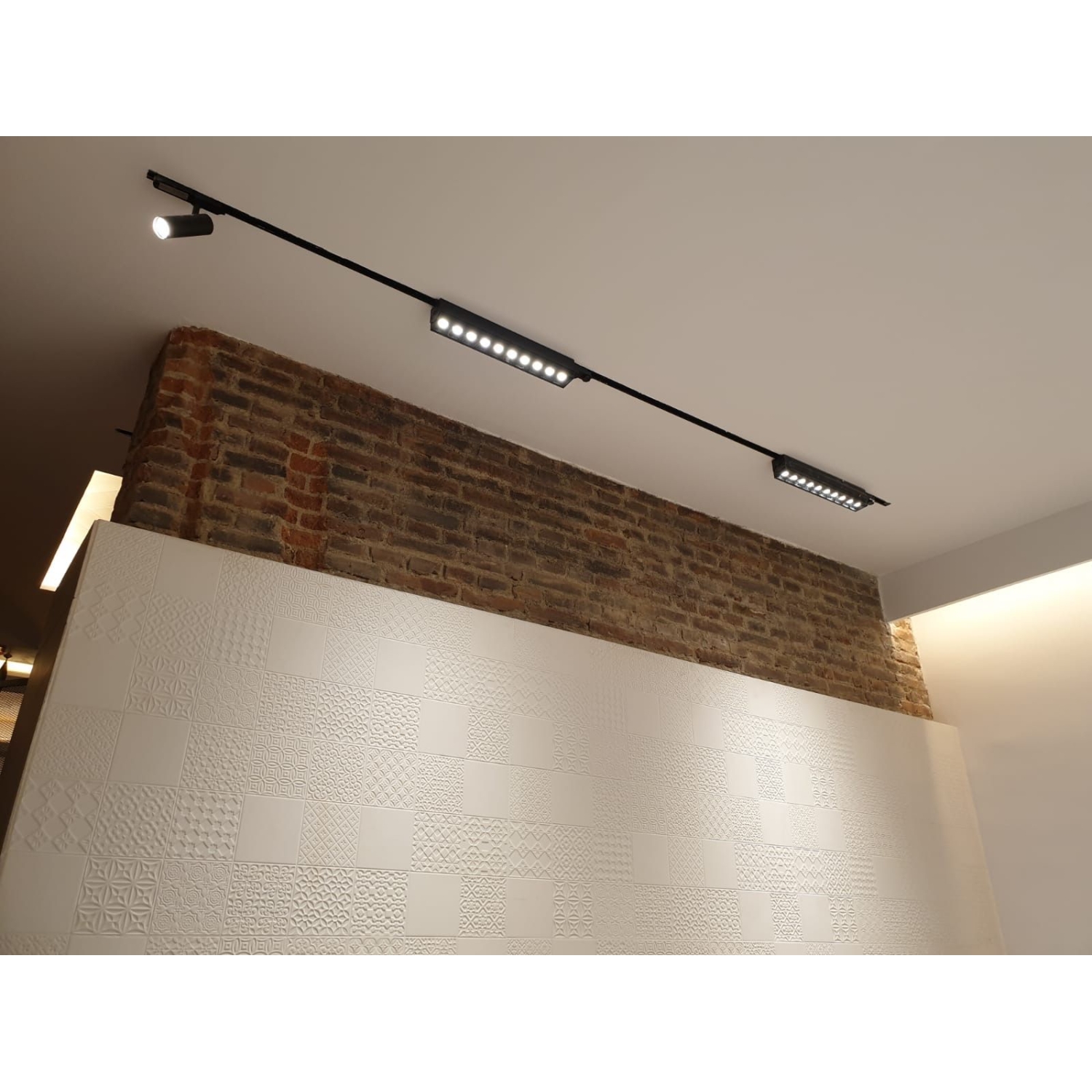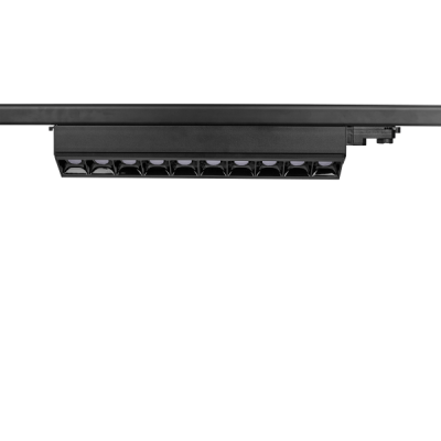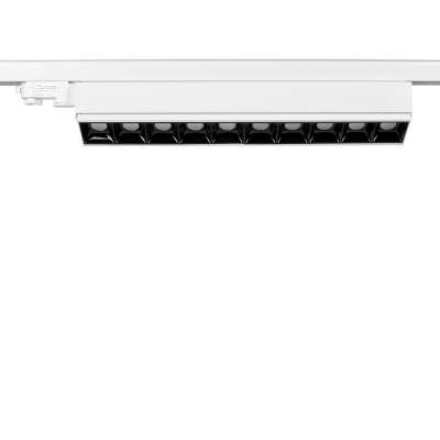 Proyector de carril lineal con adaptador trifásico, en 50W de potencia y alto confort visual, formado por módulos ópticos individuales de 5W con un diseño longitudinal, ideales para espacios comerciales, restauración y hostelería.