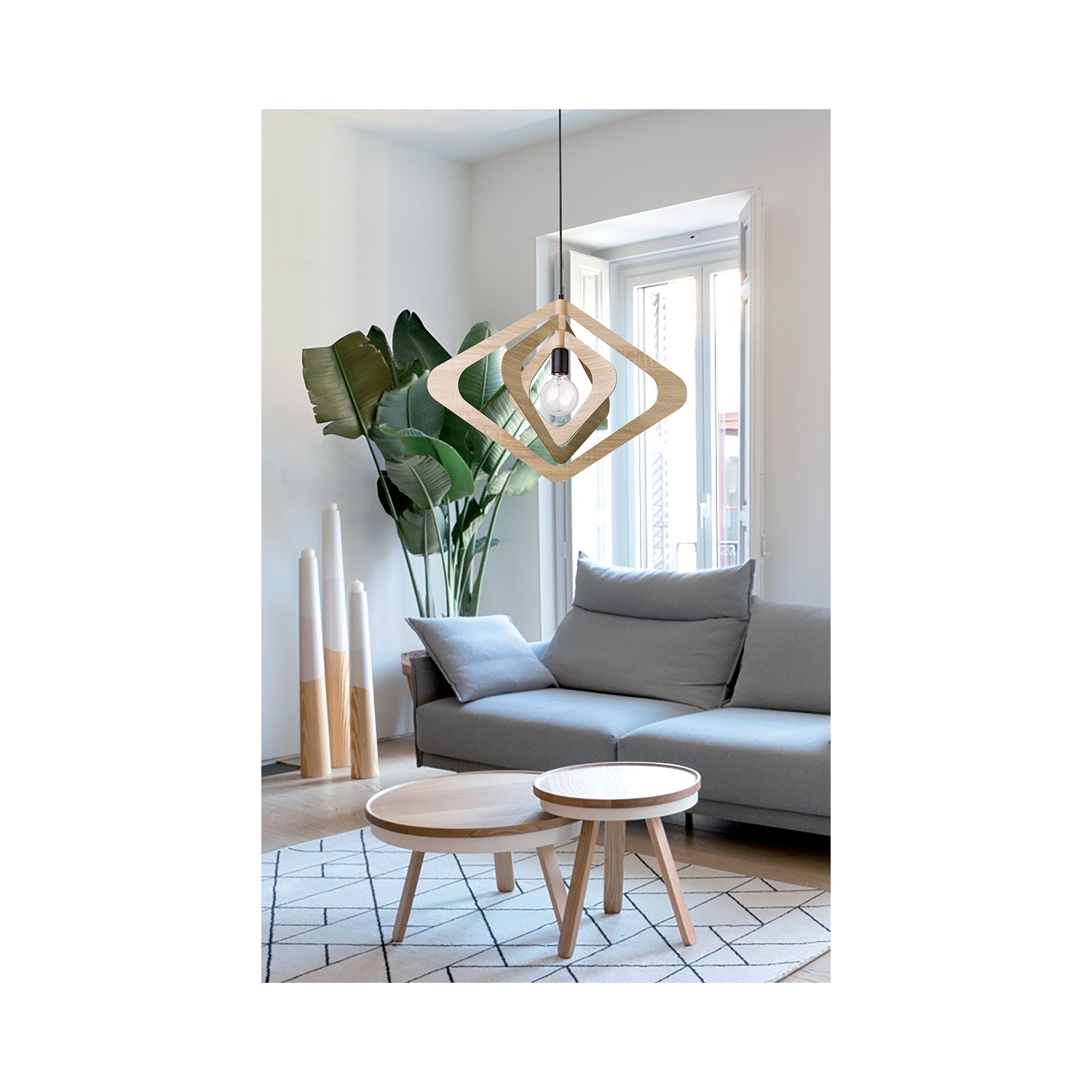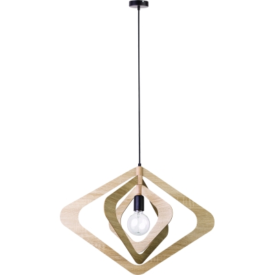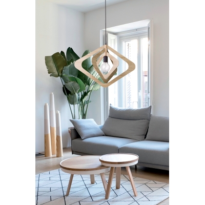 Recortes de madera en forma de rombo y con diferentes tonalidades crean un plafón colgante giratorio que aporta movimiento y armonía a cualquier espacio. Las curvas del diseño añaden un toque retro.
