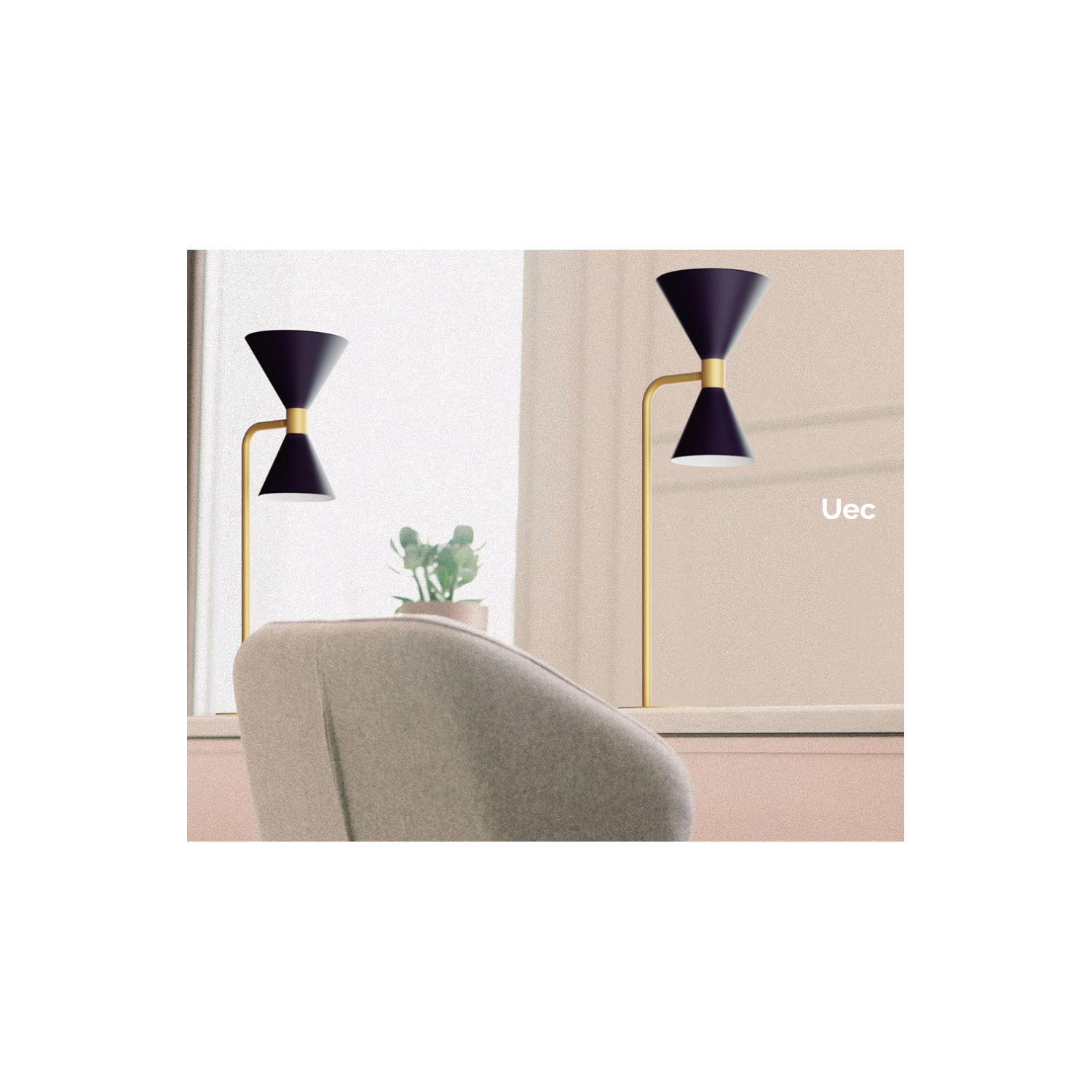 La colección Uec se fabrica en dos acabados: blanco y dorado o negro y dorado. Con su doble pantalla metálica que proyecta su foco de luz hacia arriba y hacia abajo se trata de una pieza muy decorativa y apropiada tanto para uso doméstico como para proyectos contract.