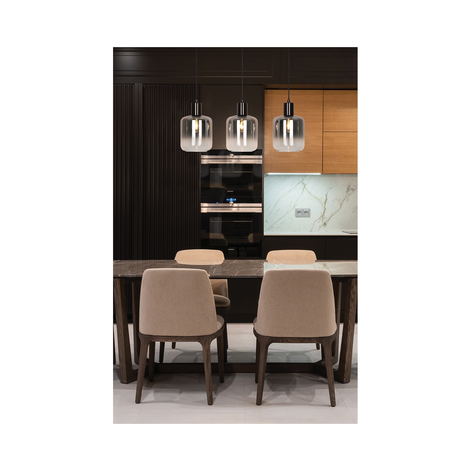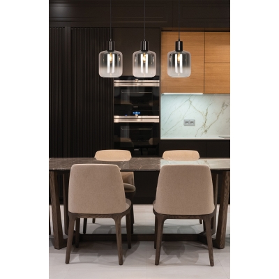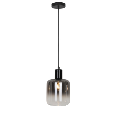 Una lámpara colgante que combina la estética moderna con la geometría retro. Ideal para casas con un diseño moderno. La construcción de metal y el vidrio degradado en el cilindro ofrecen dramatismo a través de un prisma minimalista y una iluminación cálida en cualquier habitación donde se coloque.