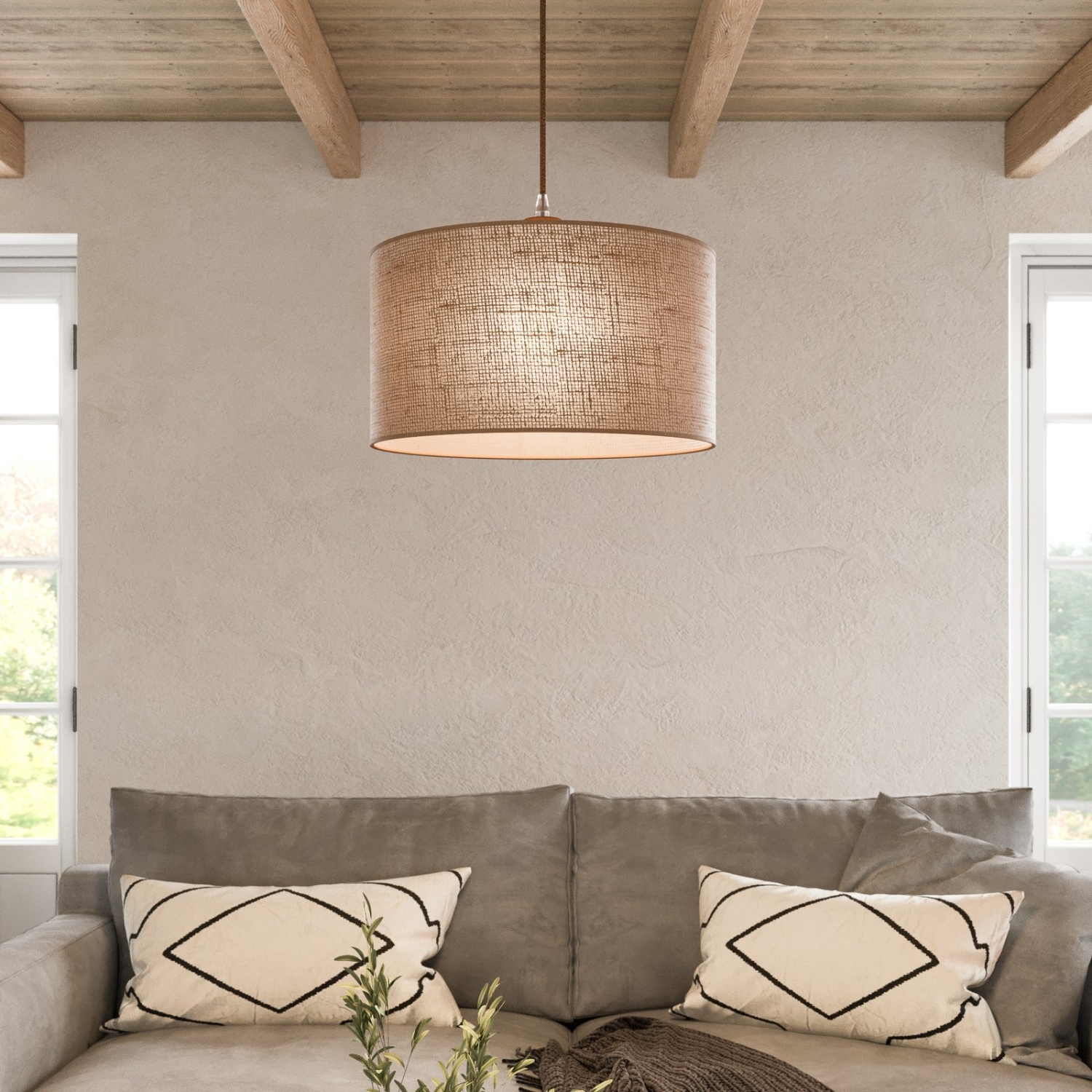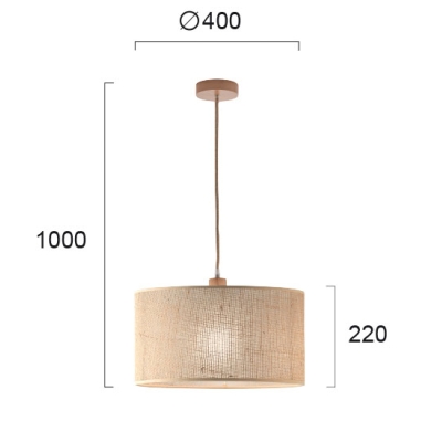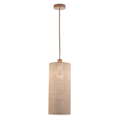La tela se combina con la madera en un cilindro voluminoso que es una opción clásica para una lámpara de techo colgante. El detalle de construcción de arpillera le da el elemento orgánico que cualquier espacio moderno con carácter necesita.