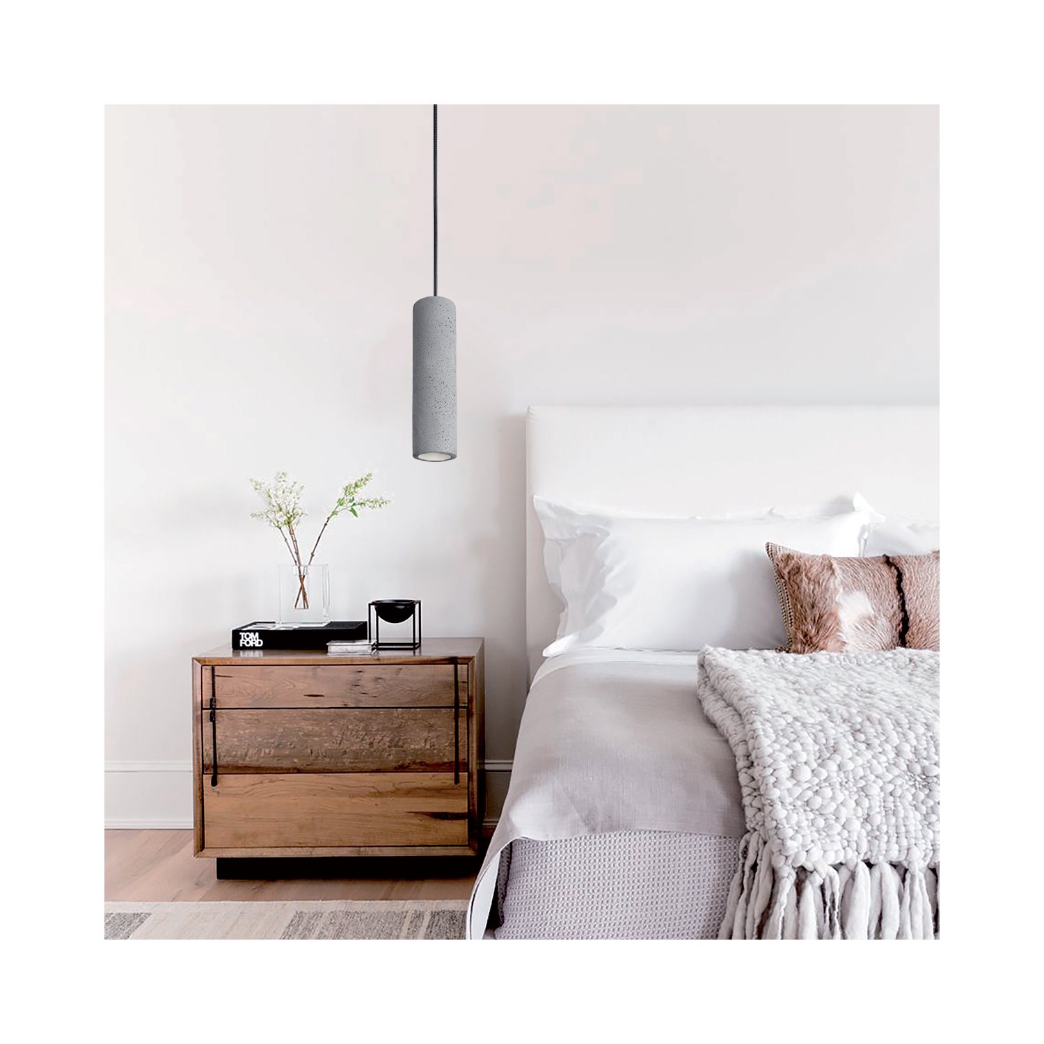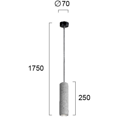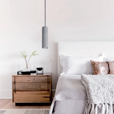 Un sutil cilindro de hormigón gris se combina con una cuerda de tela para crear una lámpara de techo colgante moderna. Referencias al diseño industrial, ideal para cualquier espacio que ame el diseño moderno.