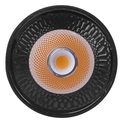 Reflector fabricado en policarbonato con acabado negro brillo y difusor de cristal transparente.