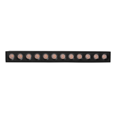 Downlight lineal para carril magnético en 12W con un alto confort visual, ángulo de apertura de 36º formado por módulos ópticos individuales de 1W con un diseño longitudinal de tamaño reducido.